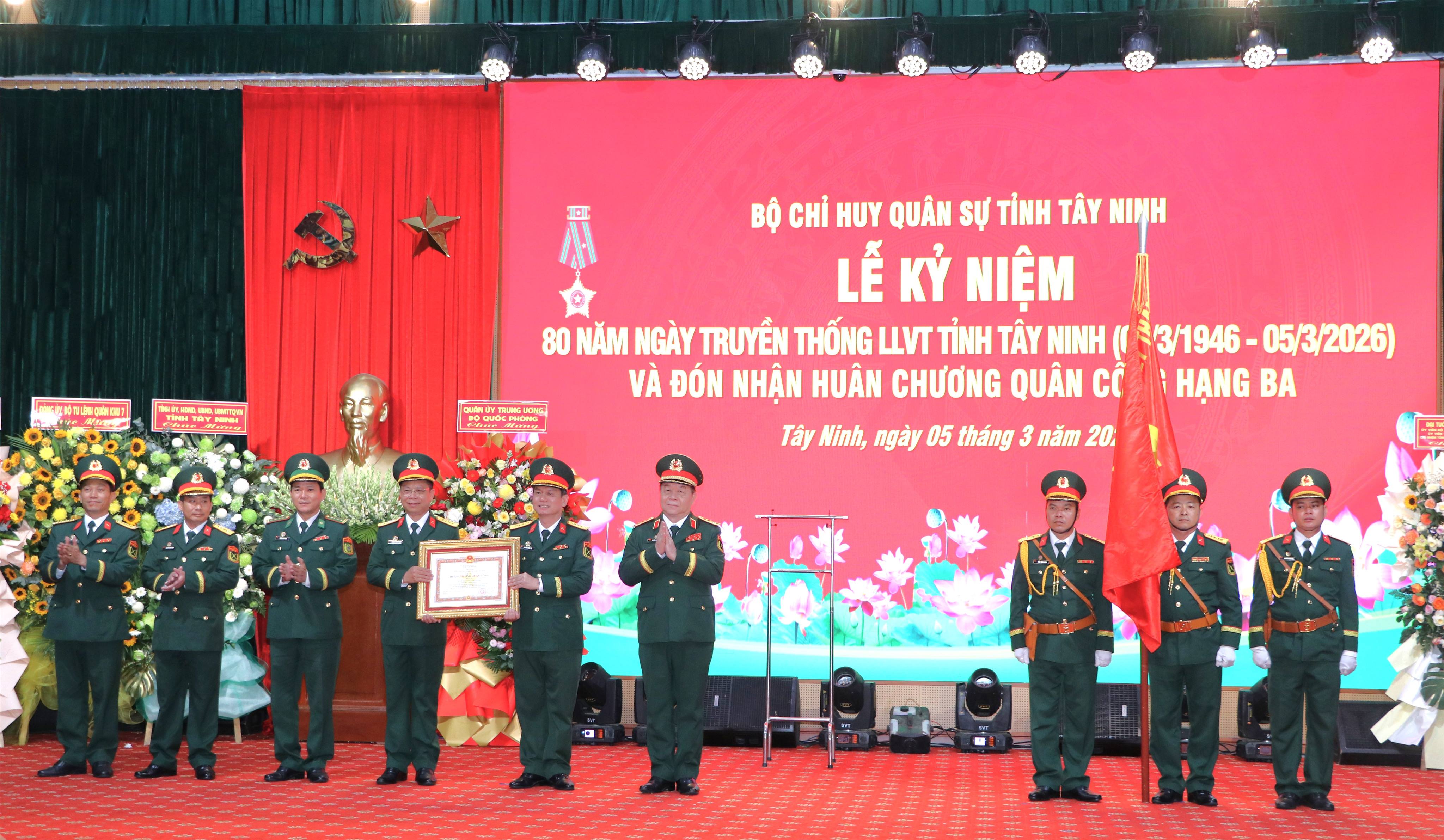 Sáng ngày 05/3/2026, Bộ Chỉ huy Quân sự tỉnh Tây Ninh tổ chức Lễ Kỷ niệm 80 Ngày truyền thống Lực lượng vũ trang tỉnh Tây Ninh (05/3/1946 -05/3/2026) và Đón nhận Huân chương Quân công Hạng Ba.