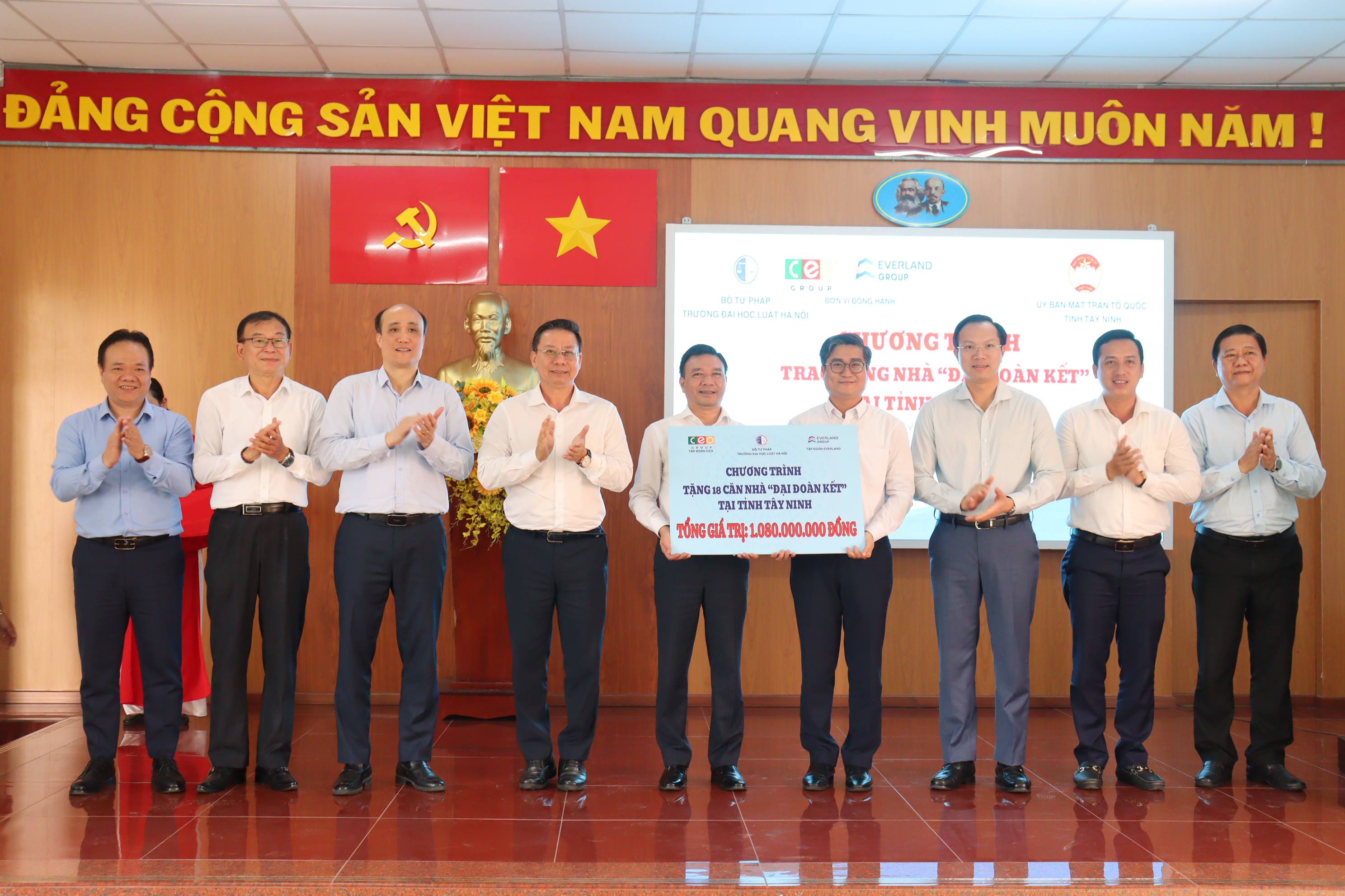 Chiều ngày 05/3, tại xã Đức Hòa, Ủy ban MTTQ Việt Nam tỉnh Tây Ninh phối hợp Trường Đại học Luật Hà Nội cùng các đơn vị, doanh nghiệp đồng hành tổ chức chương trình trao tặng Nhà “Đại đoàn kết” cho các hộ gia đình có hoàn cảnh khó khăn trên địa bàn tỉnh. Dự chương trình có Thứ trưởng Bộ Tư pháp Nguyễn Thanh Ngọc; Ủy viên Ban Thường vụ Tỉnh ủy, Phó Chủ tịch UBND tỉnh Đoàn Trung Kiên; Bí thư Đảng ủy Trường Đại học Luật Hà Nội Chu Mạnh Hùng.