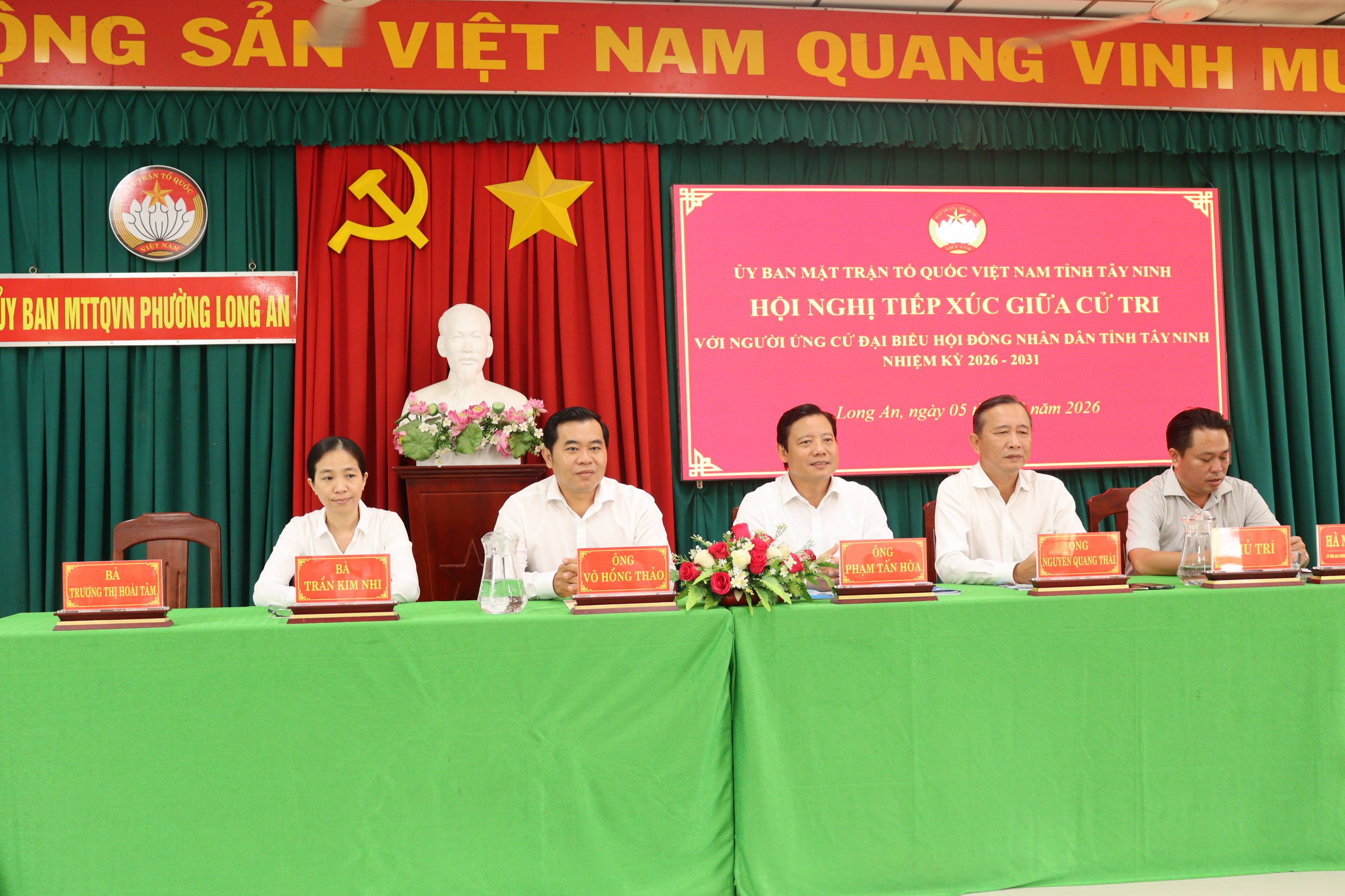 Sáng ngày 05/3, tại phường Long An, Ban Thường trực UBMTTQ Việt Nam tỉnh Tây Ninh tổ chức Hội nghị tiếp xúc giữa cử tri với những người ứng cử đại biểu Hội đồng nhân dân khóa XI, nhiệm kỳ 2026–2031, thuộc đơn vị bầu cử số 24.