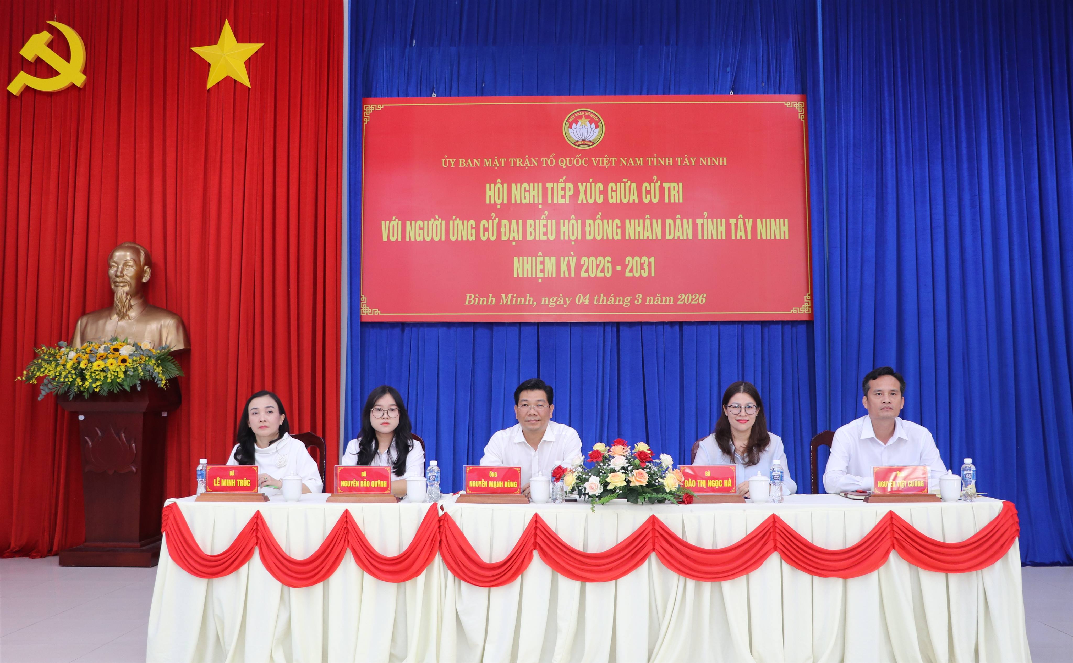 Chiều ngày 04/3/2026, Ban Thường trực Ủy ban MTTQ tỉnh tổ chức hội nghị tiếp xúc cử tri, vận động bầu cử đối với những người ứng cử đại biểu HĐND tỉnh, nhiệm kỳ 2026-2031, tại đơn vị bầu cử số 01 tại phường Bình Minh.