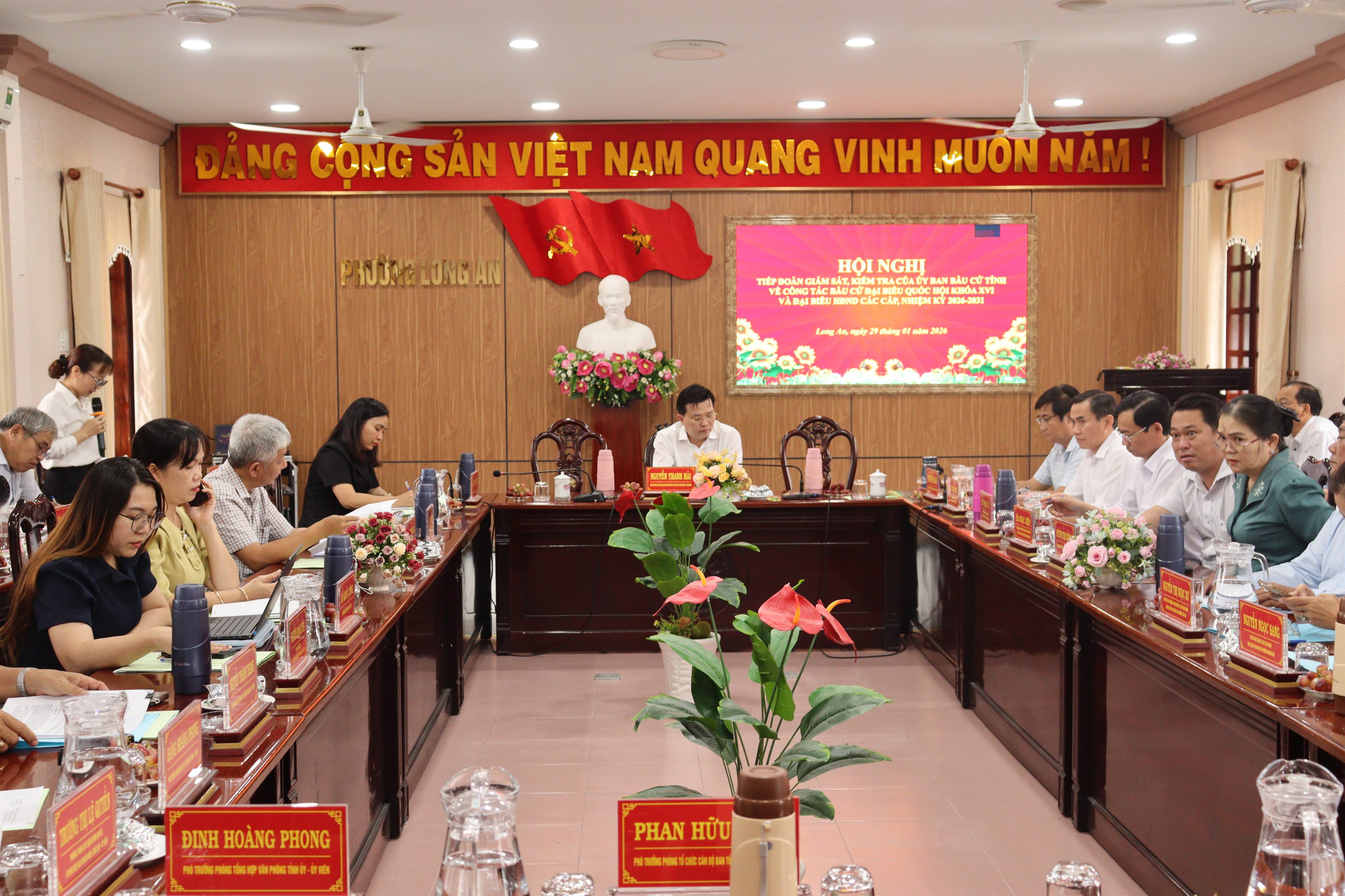 Chiều ngày 29/01/2026, Đoàn giám sát, kiểm tra số 3 Ủy ban bầu cử tỉnh Tây Ninh do Phó Bí thư Tỉnh ủy, Chủ tịch Ủy ban MTTQVN tỉnh Nguyễn Thanh Hải - Phó Chủ tịch Ủy ban bầu cử tỉnh làm trưởng đoàn có buổi làm việc với các phường Long An, Tân An, Khánh Hậu và xã Mỹ An, nhằm giám sát, kiểm tra về công tác bầu cử đại biểu Quốc hội khóa XVI và đại biểu HĐND các cấp nhiệm kỳ 2026-2031.